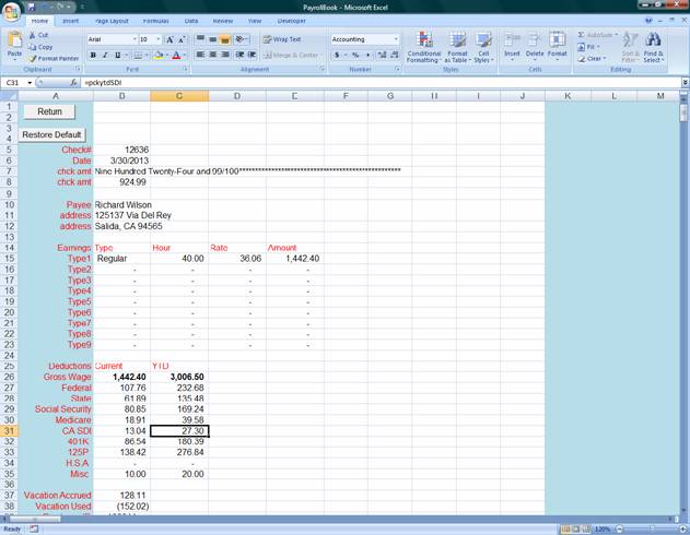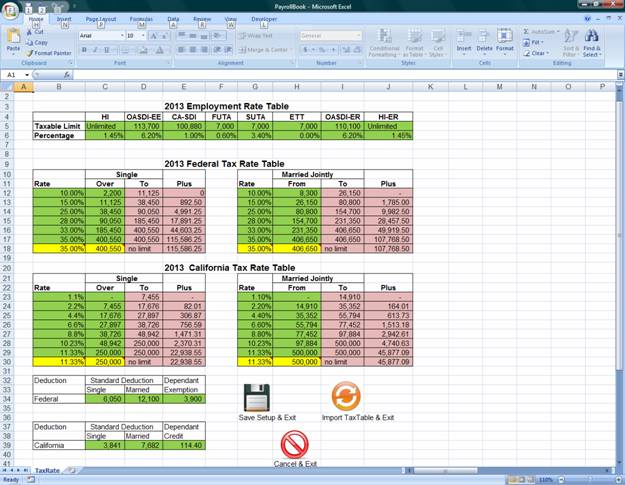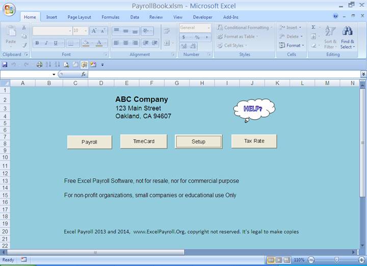 10. Technical Data: (a) Runs on Excel 2007 or higher version (b) Minimum hard drive space: 10M (c) Maximum number of employees: 200 (d) Maximum active employees in timecard: 57 (e) Minimum pay rate: 7.50 per hour (f) Maximum pay rate: 48,07.69 per hour (g) Maximum payroll per year: 3,640 (h) Maximum wages per employee per year: 458,300.00 (i) Maximum amount on check is $99,999,999.99 (j) Years of use: 5 year backward and 2 years in advance from current (k) Life of the program: 2008 through 2100 Note: · This program was designed for accounting students and for small business use only. Thus, I designed these technical data to limit the users. · You may have up to 1000 employees in the database with 200 employee in batch payroll, but if you have more than 50 active employees in the company then you are not a small business and please do Not use this program. You are not qualified for free use. · You are required at lease to pay your employee at minimum of $7.5 per hour in order to use this program · If you pay more than $458,300.00 per year to an employee or pay over 4807 per hour then you are not qualified for using this program for free or the tax withholdings will not be accurate. It is because you are not small business. · If you make more than 3640 payroll transactions per year, then you are not qualified for using this program. · If you are a non-profit organization and have more than 57 active employees or have more than 3640 payroll transactions per year, please contact me to increase or remove the limit for you. |