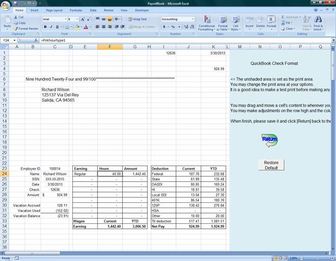 Vacation accrual: the first green column “Yr of Srv” stands for “Year of Service” from the date of hired. Please see the sample entries. In the “Order” column line 1, the entry 1 for the 1st year of service accruing 40 hours; after one year, starting the 2nd year ( 2 in order line 2), accruing 80 hours per year until the 5th year (after the 4th anniversary); starting the 5th year of service, 120 hours and so on… Payroll Period: You may select different payroll periods from weekly, bi-weekly, monthly quarterly, or annually. This is for payroll tax computation purpose only. It has nothing to do with when and how often you pay your employees. Standard Check: Check format preset for QuickBook, Quicken, Peachtree, SBT, Great Plains, Platinum, and other self-design check formats. You may select one of them to print your check. You may even make adjustments after your selection if the print-outs do not match the positions on your check. Customize Check: You can design your own brand-new check layout by clicking this button. You can print out your check any way you prefer. To do this, selection “Customize” and click on [Check Setup]: (Figure 3) After you clicked the [Check Setup] button, (see figure 3) what you need to do is to drag and move the selected information you want to where you want to print on your computer check. After you selected, moved, or formatted the information you prefer, please make sure you select and set the Print Area, under “Page Layout”=> “Print Area” => “Set Print Area”. Also you may use Excel menu to do a few test print pages to make sure the information printed properly at the right positions on your check. The information in red ink is only the description for you to understand as a note. They won’t change during the payroll process. The information in black ink will change from check to check (or payee to payee). In case you forgot the description, or messed up with the information, or want to reset your check design, you may click the [Restore Default] button to restore the information and the positions back to where they were before. You change the width, high or positions of the printing information. You may also rearrange any of the pre-designed checks from standard check formats as well as the customized check. The following picture (figure 4) shows the selected QuickBook check and it can be re-positioned by moving the information to the wanted positions. Please make sure select an area to be set as “Print Area” for payroll check. (The default setting is the blank area to be printed) (Figure 4) Click [Return] when finish your check setting. You may save your settings through Excel when you make changes. Make a test print and generally you should only set to print one page per check print.