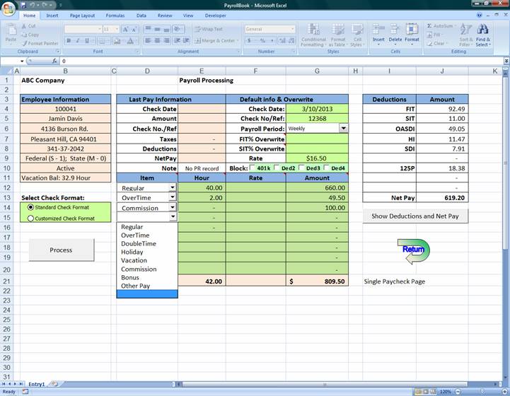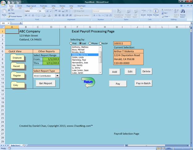 Step 1: Select John Smith in the selection window Step 2: Click on [Pay] button Step 3: Click on cell “G4” to select or enter the current date as the pay date Step 4: Leave check number and the pay rate as they are (You may change them if you would) Step 5: Select “Regular” and enter 38.75; select “overtime” and enter 1 Step 6: Click on [Show Deductions and Net Pay] to view the total or detail. Step 7: You may change the date, check number, hours, or rates if they are incorrect in Step 6 Step 8: Click on [Process] button to process the payroll and click “Yes” to print a check. Note: Step 6 and 7 are an optional; you may skip them to Step 8 if you are sure the numbers are correct. 5. Pay all employees using the batch method Step 1: Click on [Pay in Batch] button Step 2: Enter 40 regular hours for each employee Step 3: Don’t make any changes on date, check number and other settings. Step 4: Click on [Run Pre-Process] to view the detail before process the batch (Optional) Step 5: Click on [Process Batch PR] button to process and print checks. 6. Void John’s paycheck in 4 above Step 1: Select John Smith in the selection window Step 2: Click the “Record” Folder Step 3: Select (highlight) the first date from the selection window on the upper left corner Step 4: Click on [Void] button and click “Yes” to confirm the void action Step 5: Click on [Return] back to selection page 7. View Folders and Get Payroll Reports · Click on each “Folder” on the left side of the selection page to view reports · Always click [Return] back to the selection page · Select a reporting period or enter dates in cells “D8” and “D9”; then select a report and click on [Get Report] · All reports are in Excel format; you may save them for your own use at your option. X. Advance Topics 1. Make accrued vacation adjustments There are two ways to make vacation adjustment if you wish: · Select an employee from the selection page and click on [Edit] button; change the “Vacation Used” in the blue Cell “E16”. This is accumulative balance of hours used. This program uses a perpetual method to keep track the vacation balance. (net balance=total vacation accrued – total vacation used). The positive balance in Cell “E16” is the hour used; not the net balance. · The second way to do is to adjust the “Length of Service”. You may change the “Date of Hire” in cell “E15” to adjust the total accrued balance. 2. Close the payroll year and Select a new payroll year This program is on a calendar base. You must close the current year before you can select a new payroll year. To do this, from this main page click on [Setup] and then click on [Year Close], you will be prompted for warming. Click “OK” to continue and type in “Close” to confirm the closing. Once the year is closed; your current year data will be saved as “Payroll Data Year YYYY.xlsm”. If you close more than once for the same year the new file will replace the old one automatically. 3. Manage payroll data It is recommended to make backup files. To create a good habit of making back up files, you may need 3-5 moveable storage drives and marking them with Monday, Tuesday, Wednesday, Thursday, and Friday. If you make a payroll on Monday, copy all files onto your Monday drive or if you make a payroll on Thursday, copy all files onto your Thursday drive. Make sure you always make copies after you each payroll. You may open and use all data files for your own use. All files are in Excel format. 4. Trouble shooting Setup Error: if it is a setup error you may not be able process payroll. These problems are likely to be the setup information error: (a) Make sure data are within the parameter and within the program limit: (b) Make sure numeric data are in number value rather than text or strings: (c) Make sure numbers are in sequential order: Selection Error: If the display employee information do not match the selection please click “Selecting by” option: First, Last, Phone, Account a few times to refresh the display window. Other Error: Contact DanielChao@hotmail.com 5. Manage more voluntary deductions: The major concept of this program is to keep the payroll process easy, simple, and brief. The four types of voluntary deductions should be classified as: Deduction 1: 401K deduction type – Tax exemption: pre-income taxes (Federal and States) Deduction 2: All tax exemption type – Income taxes, FICA taxes, Local taxes, FUTA, and SUTA. Deduction 3: Partial tax exemption type – Such as Health Saving Account contribution. Deduction 4: Post tax deduction type – Loan Payment, garnishment and other deductions. Based on these 4 types of deductions, you should be able to manage all the needs of your payroll deductions. For example, if you have many insurance co-pays, loans and garnishments, the enclosed supplementary spreadsheet should be able to help you keep your subsidiary clear: